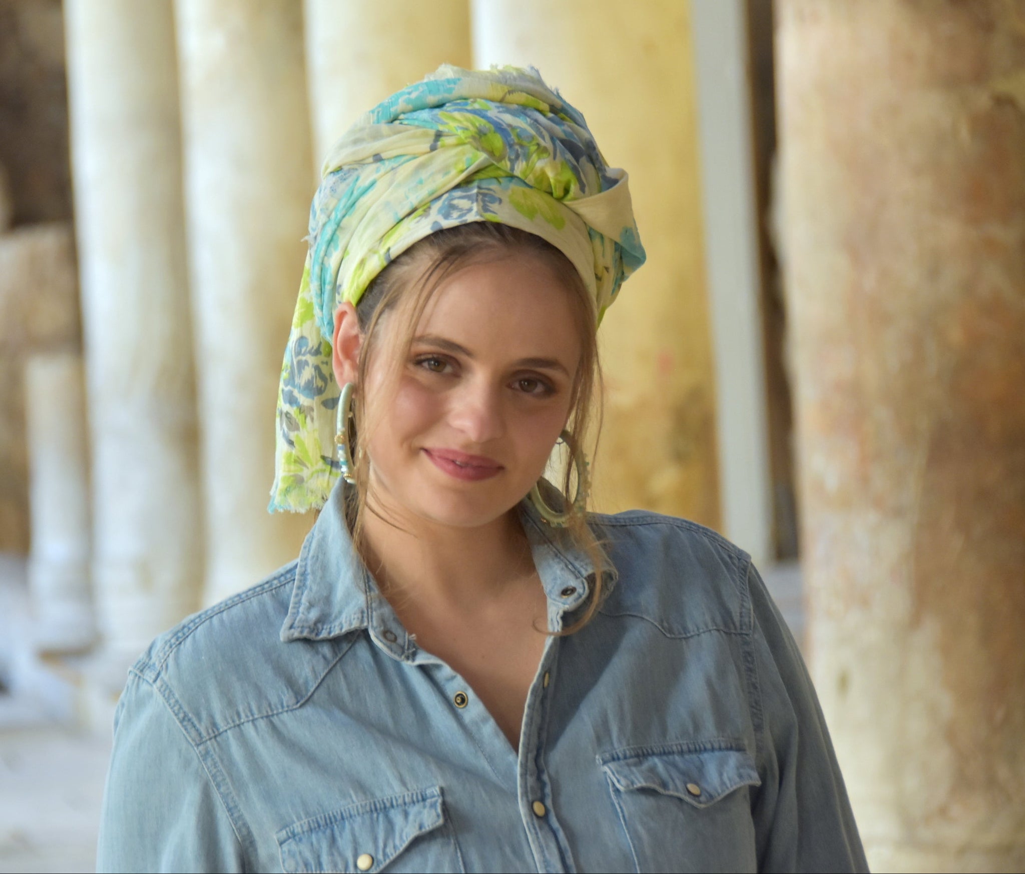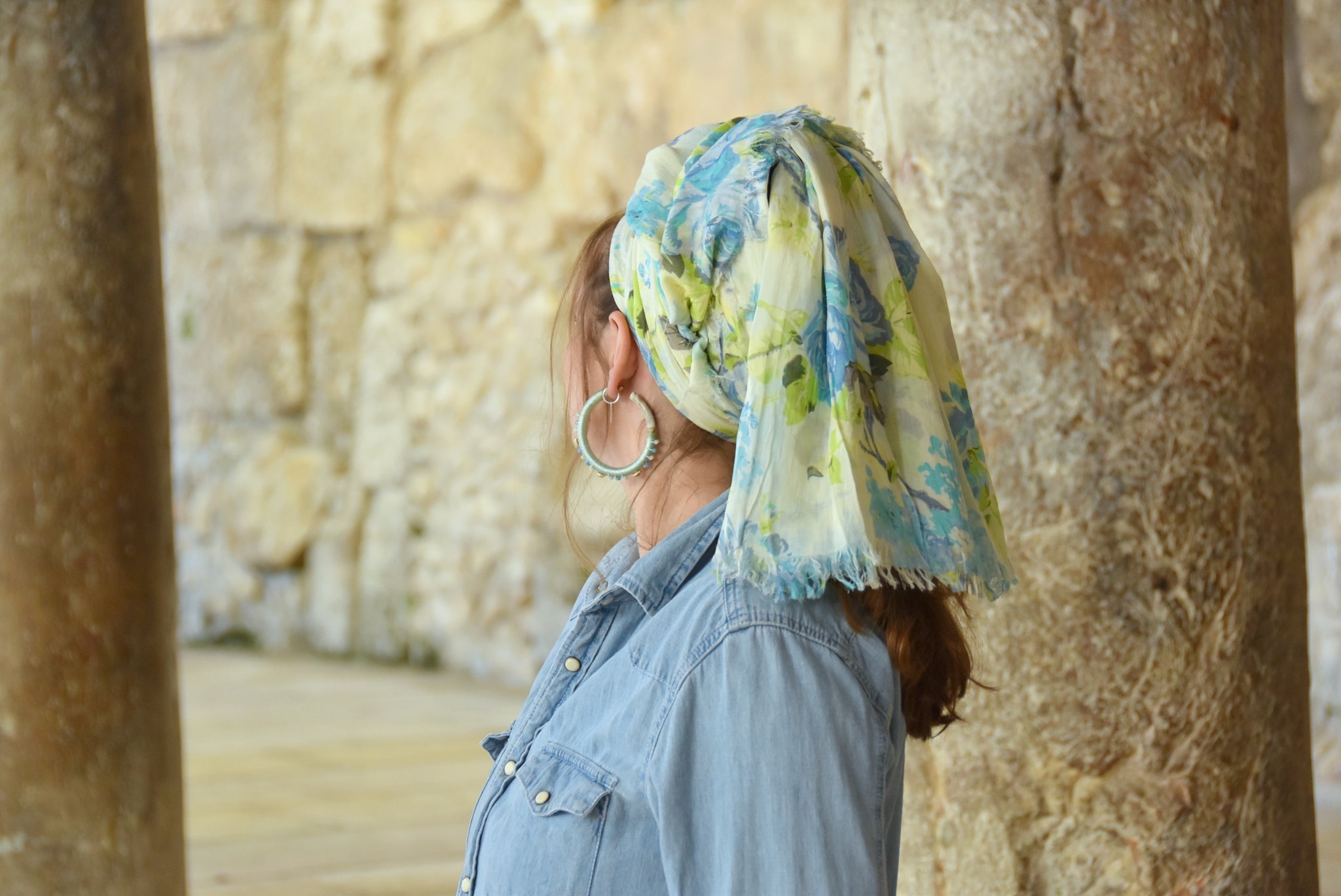 Woman wearing a colorful headscarf and denim jacket against a textured wall.