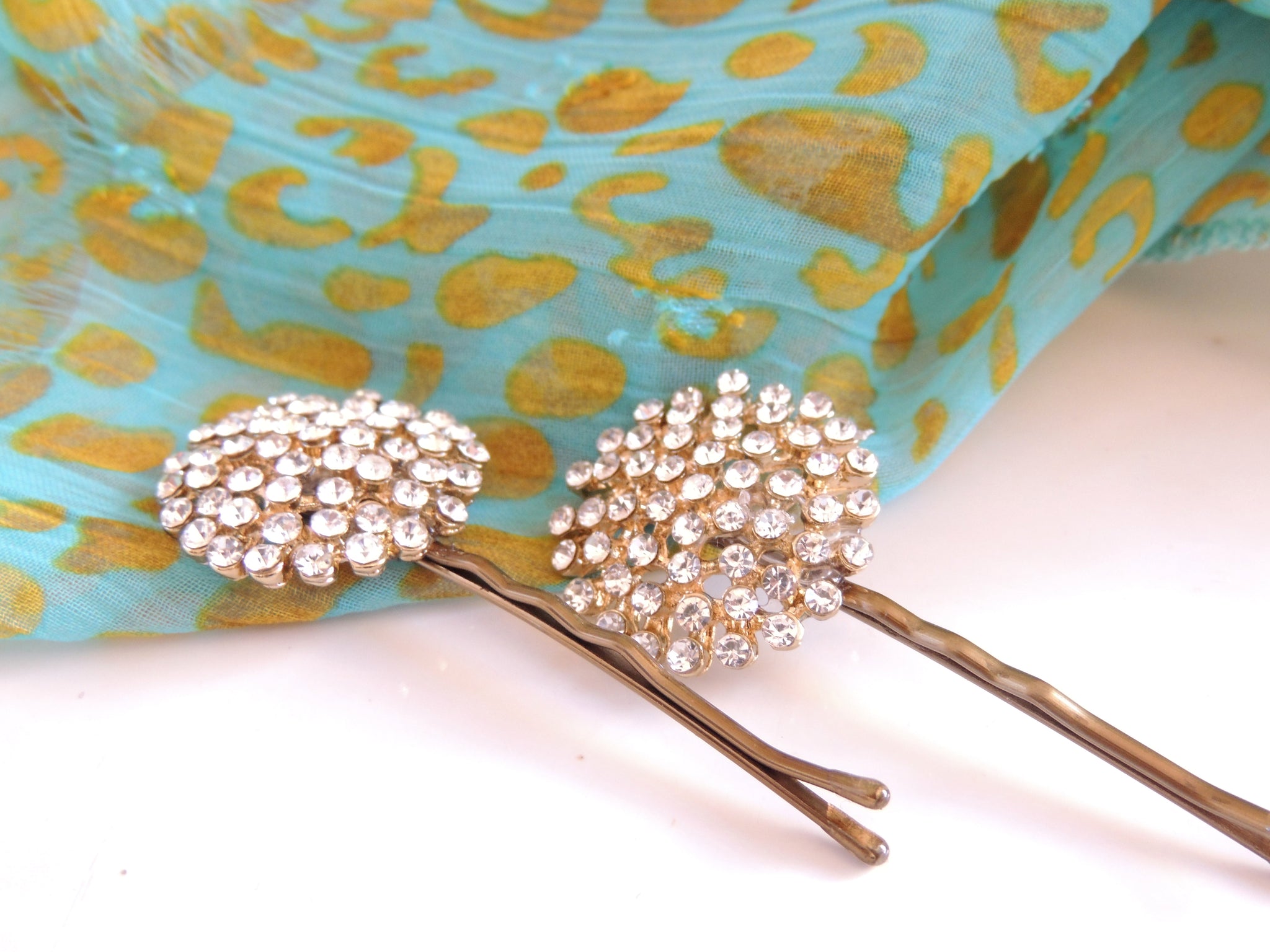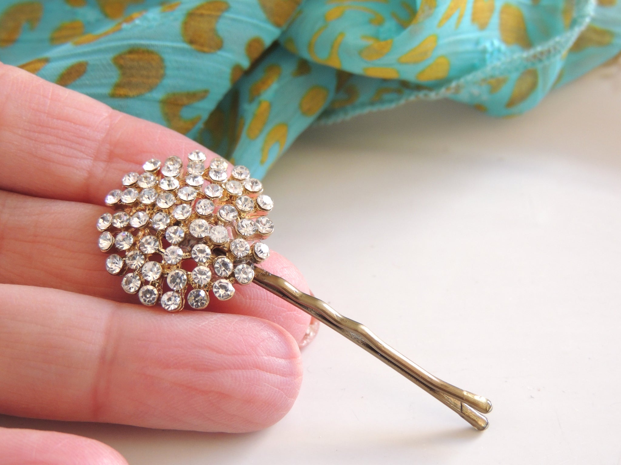 Decorative hairpin with rhinestones on a blue fabric background