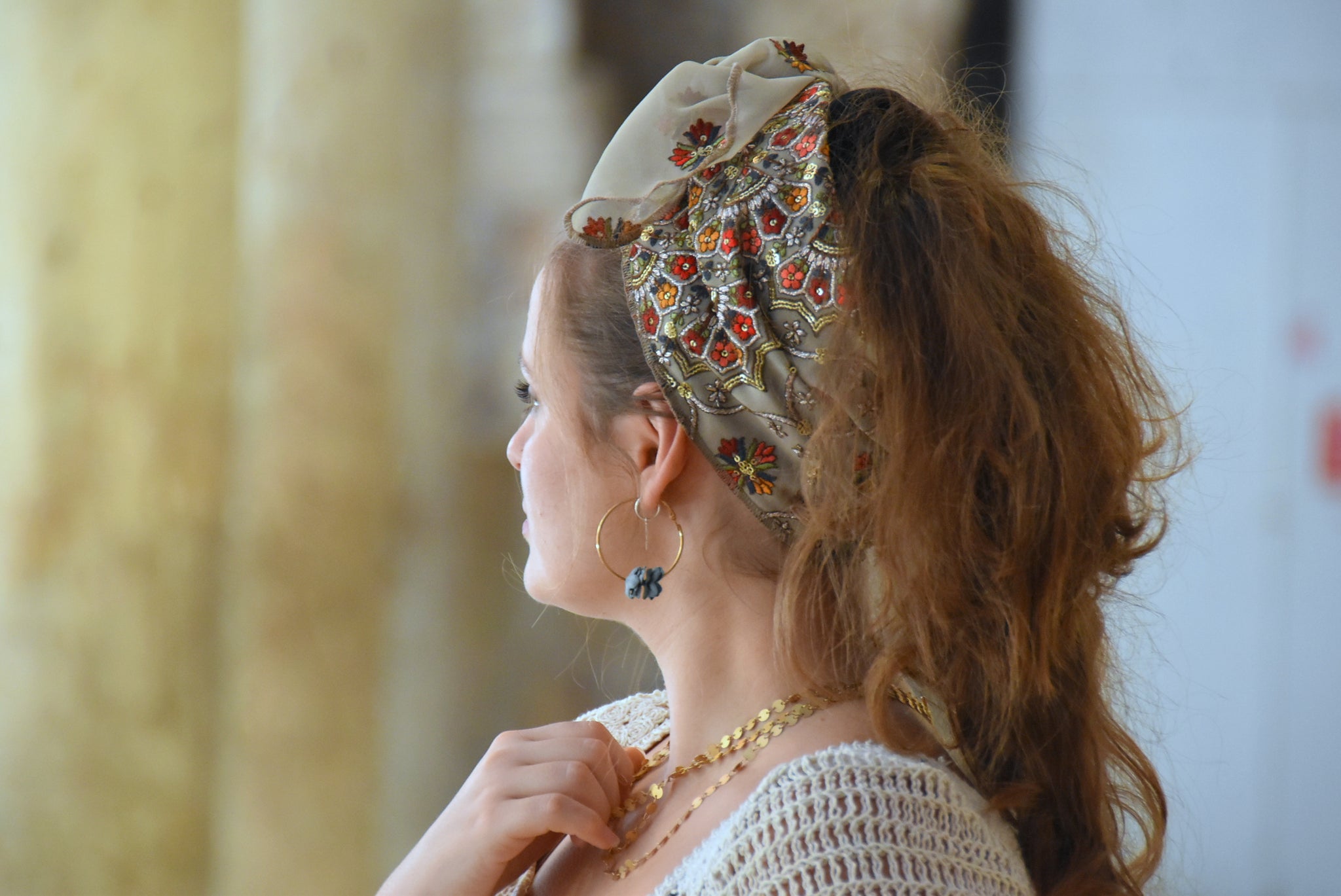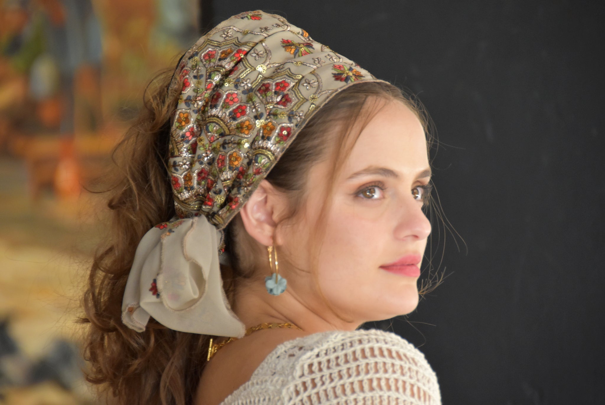 Unique & Shiny Embroidered Khaki and Gold Colorful Original One Tie Headband handmade "Mitpachat", Head Covering, Scarf, Tichel,
